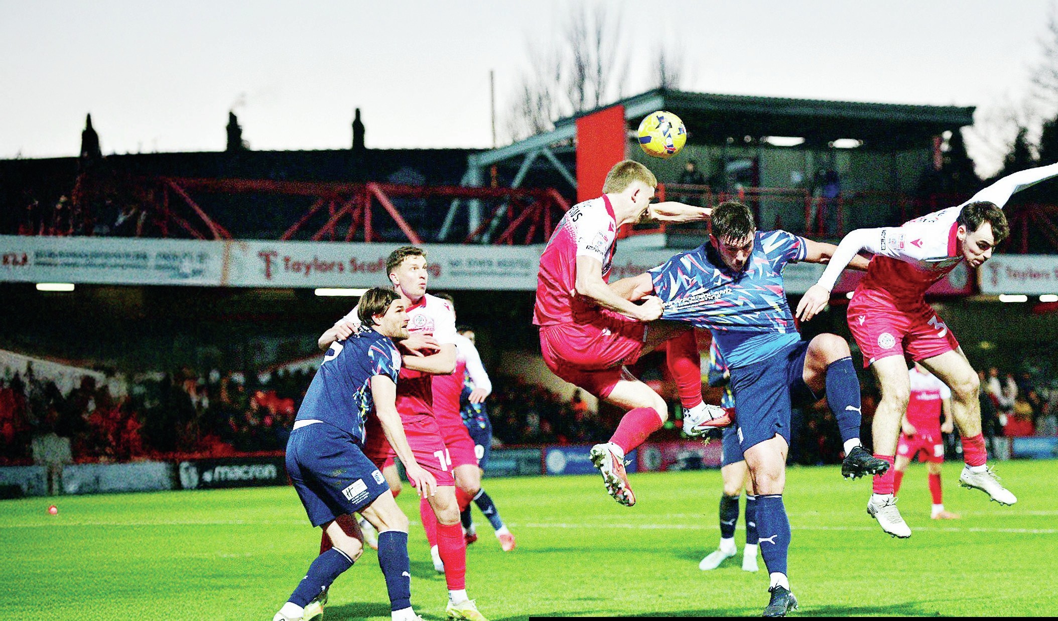 UP FOR IT: Barrow’s Niall Canavan is sandwiched as he challenges for a header