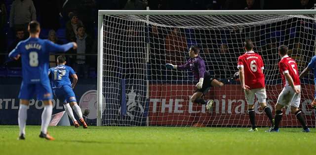 On their way: Scott Fenwick breaks the deadlock in extra-time in Pools’ 2-0 second round replay win over Salford City (photo by Action Images / John Clifton)