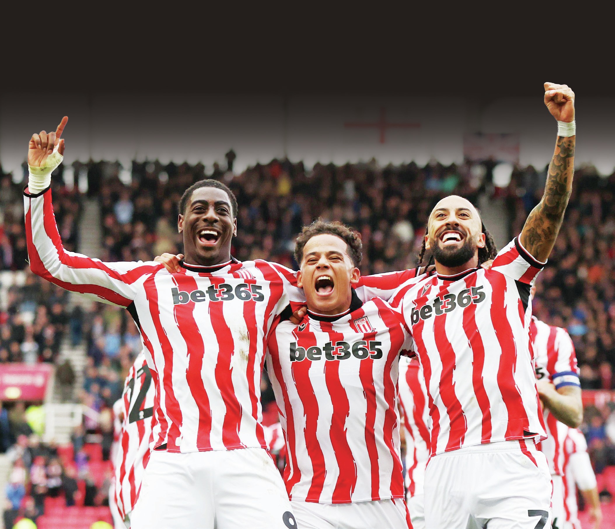 FEELING LIKE A MILLION DOLLARS: Stoke’s Million Manhoef, centre, celebrates with hat-trick hero Divin Mubama, left, and Sorba Thomas