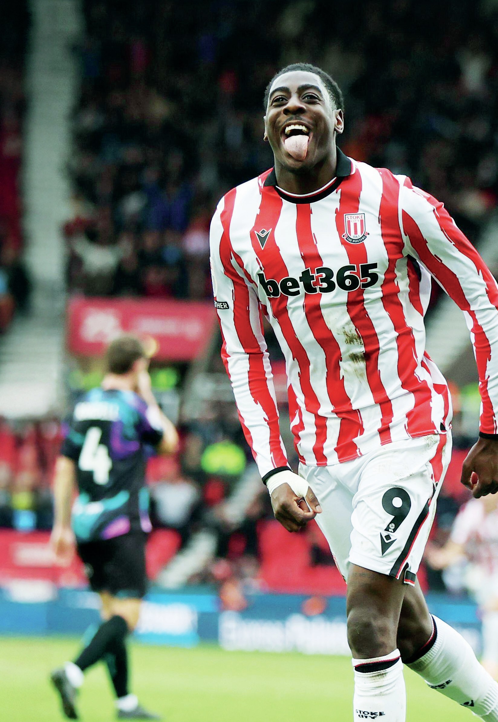 GOT ’EM LICKED: Stoke’s Divin Mubama enjoys his second goal in the 5-1win against Bristol City last weekend