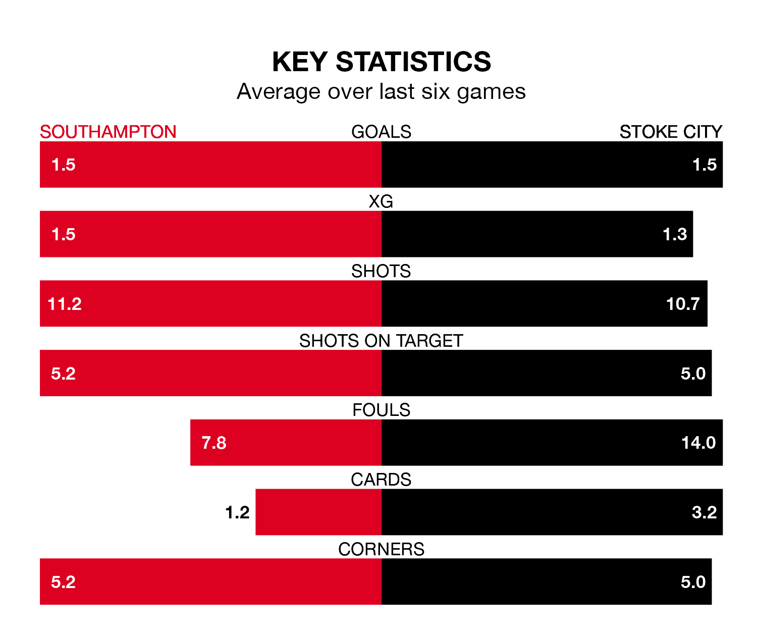 Stoke, meanwhile, are below average scorers, with 1.0 goal per game, compared to a league average of 1.3. They have conceded 1.4 goals per game.