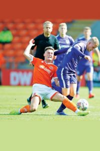 By Drew Dacre CRUNCH: Portsmouth’s Andy Cannon is tackled by Blackpool’s Jordan Thompson and, inset, the hosts enjoy Armand Gnanduillet’s goal...
