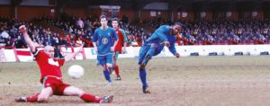 EARLY YEARS: Dwayne Plummer scores for AFC Wimbledon in their Ryman Premier Division match against Windsor & Eton in 2006 PICTURE:...