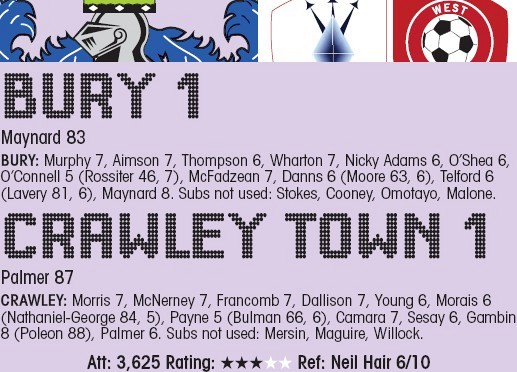 By Neil Goulding STAR MAN LUKE GAMBIN Crawley MANAGER Ryan Lowe lamented two missed points as his Bury team were held...